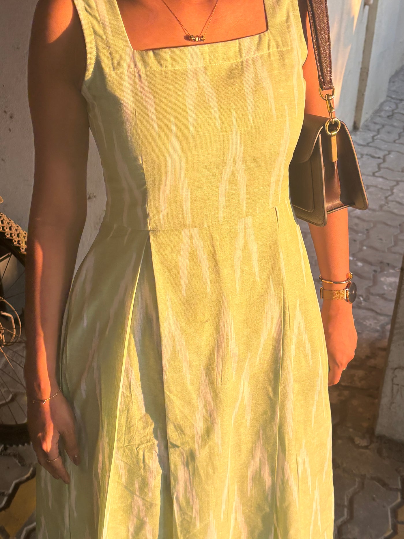 A fresh, breezy midi dress designed for effortless elegance. Crafted in a soft pastel green hue with subtle ikat-inspired patterns, this sleeveless silhouette features a flattering square neckline and a cinched waist that flows into a graceful flared skirt. With a back knot detailing. The lightweight fabric adds comfort while keeping the look polished and feminine—perfect for sunny day outings, brunch dates, or casual gatherings. Pair it with minimal accessories for an easy, chic vibe.